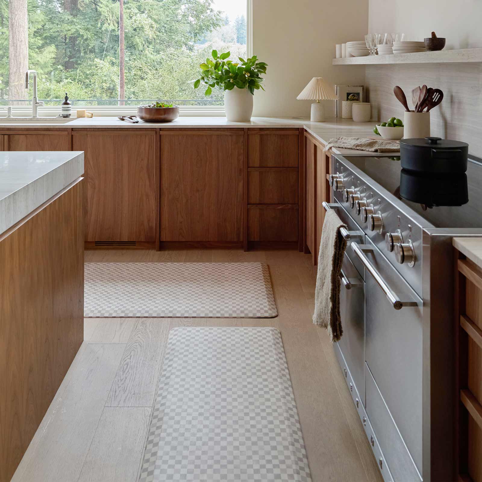 Our best-selling watercolor checker print, now available as a standing mat. With its clean lines and soft hand-painted texture, our Checker standing mat brings a bold and balanced look to any space. This anti-fatigue mat is crafted with thick, ergonomic foam that contours to your feet and reduces stress from standing — and it wipes clean for no-stress messes.