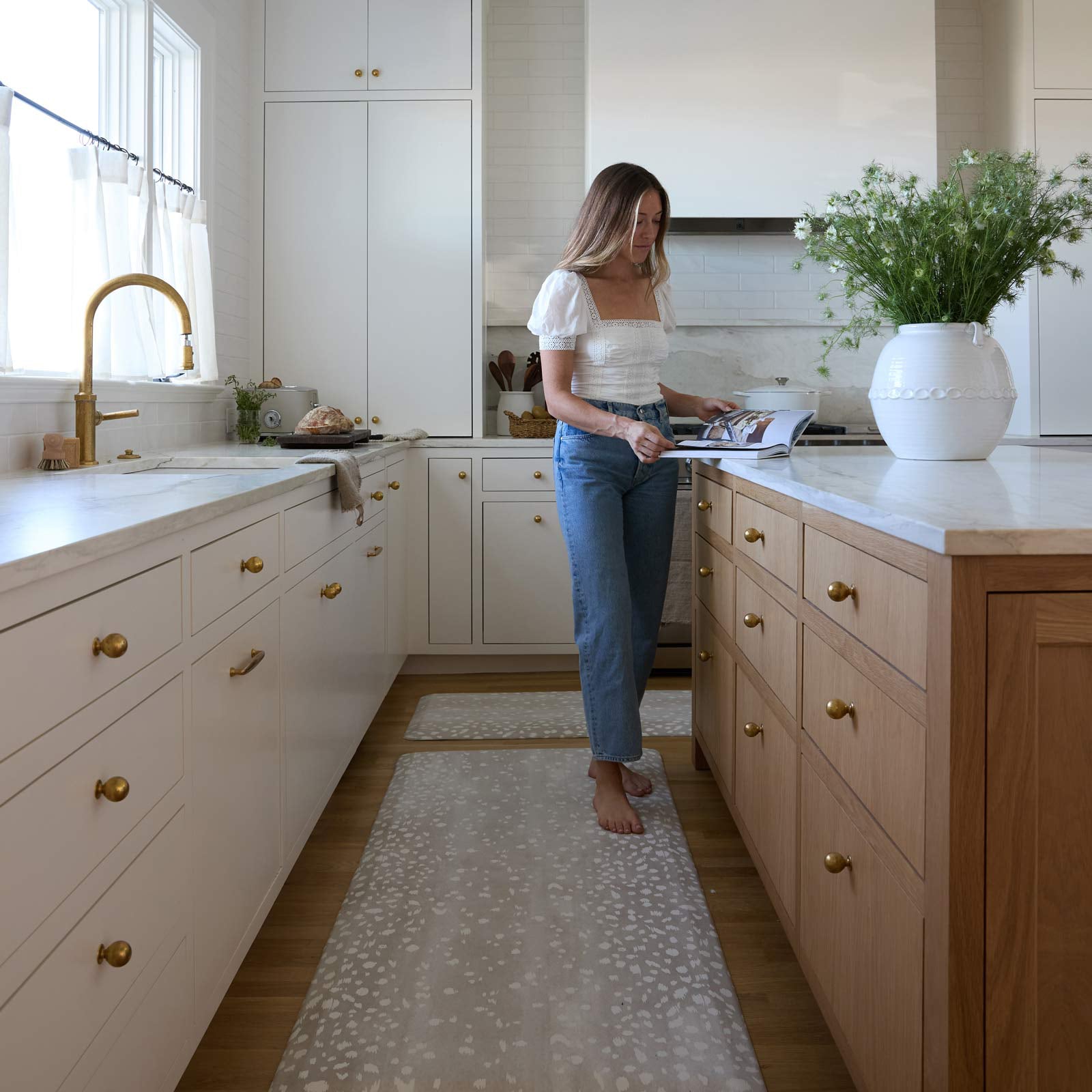 22x36Our best-selling nature inspired print, now available as a standing mat. With its hand-painted scattered spots, our standing mat in Fawn's whimsical design is sure to bring a cozy, charming feeling to any room. This anti-fatigue mat is crafted with supportive ergonomic foam that contours to your feet, so you can enjoy comfort and wipe-clean peace of mind in all of the places you stand most.