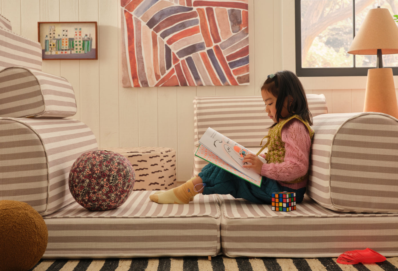 Consider soft, multi-functional pieces that evolve with your child’s needs to support your space without adding clutter. House of Noa’s Soft Modular Furniture Collection is a thoughtful way to create a cozy play or reading area while maintaining a clean, modern look. These low-profile, cushioned pieces can double as lounge seating, play surfaces, or soft landings for early movers and they’re beautiful enough to leave out.