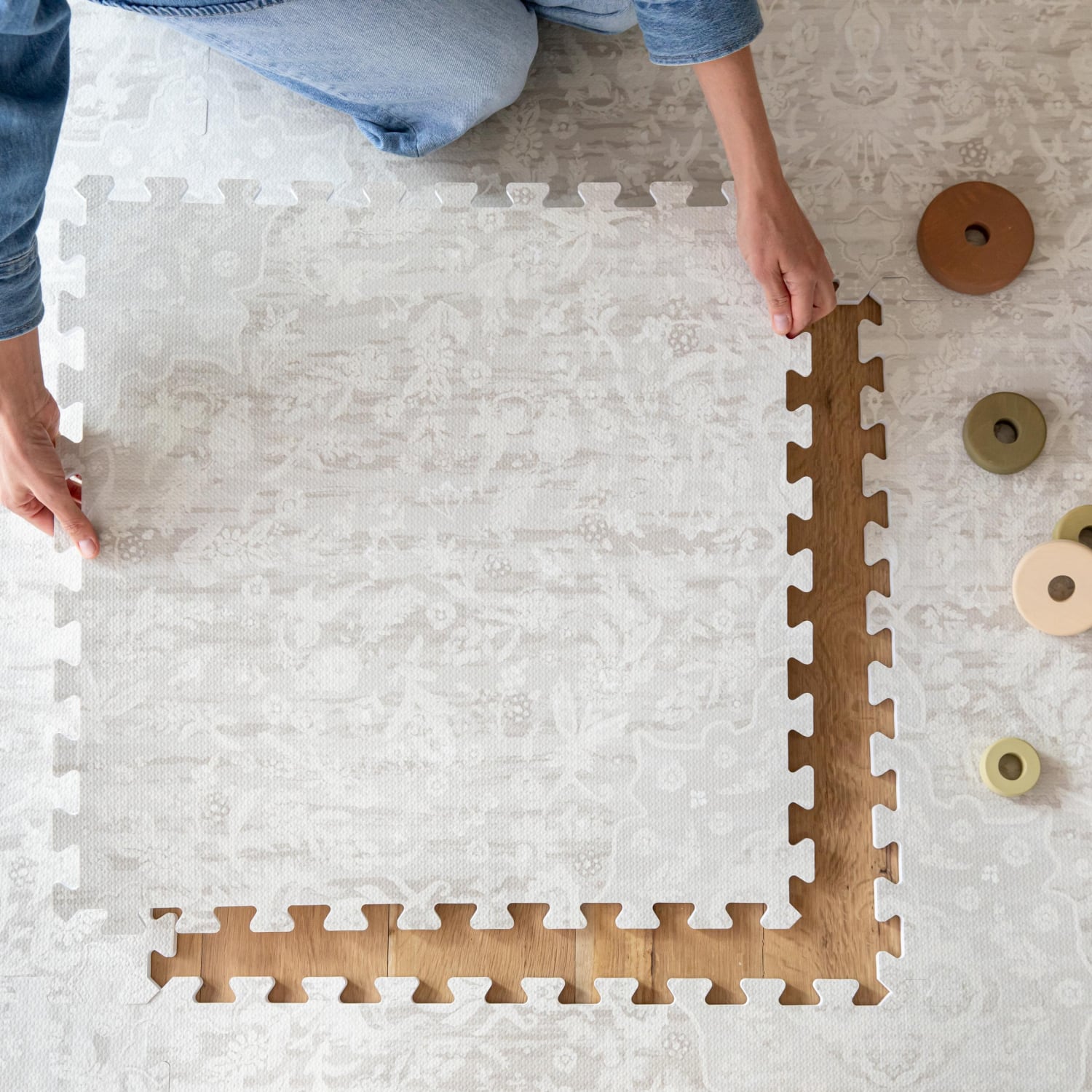 All of our play mats are comprised of deluxe 2ft x 2ft tiles which each include edging bonders for a truly rug-like look. Pro tip: Because of our flexible puzzle-piece design, multiple play mats can be connected to create a different size than what's listed.