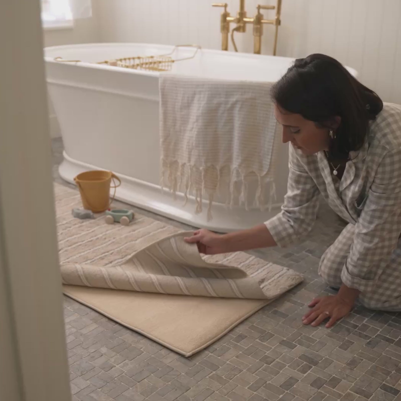21x34 + LinerBath mats, reimagined. Extra padded & plush, our collection of handmade cotton bath rugs are designed to bring a fresh new perspective to your bathroom. Each mat comes with a separate memory foam pad for unmatched comfort, making it extra supportive for your knees while bathing little ones, and oh-so-comfortable while stepping out of the bath or shower. Available in standard and runner sizes to fit at your sink, shower or tub.