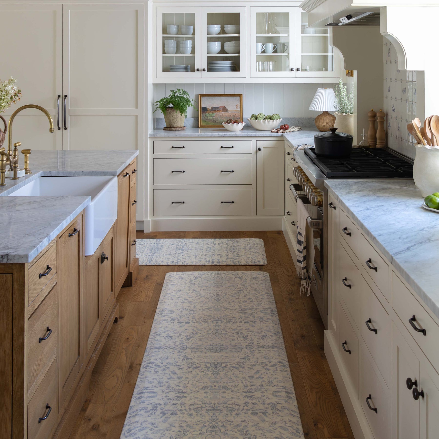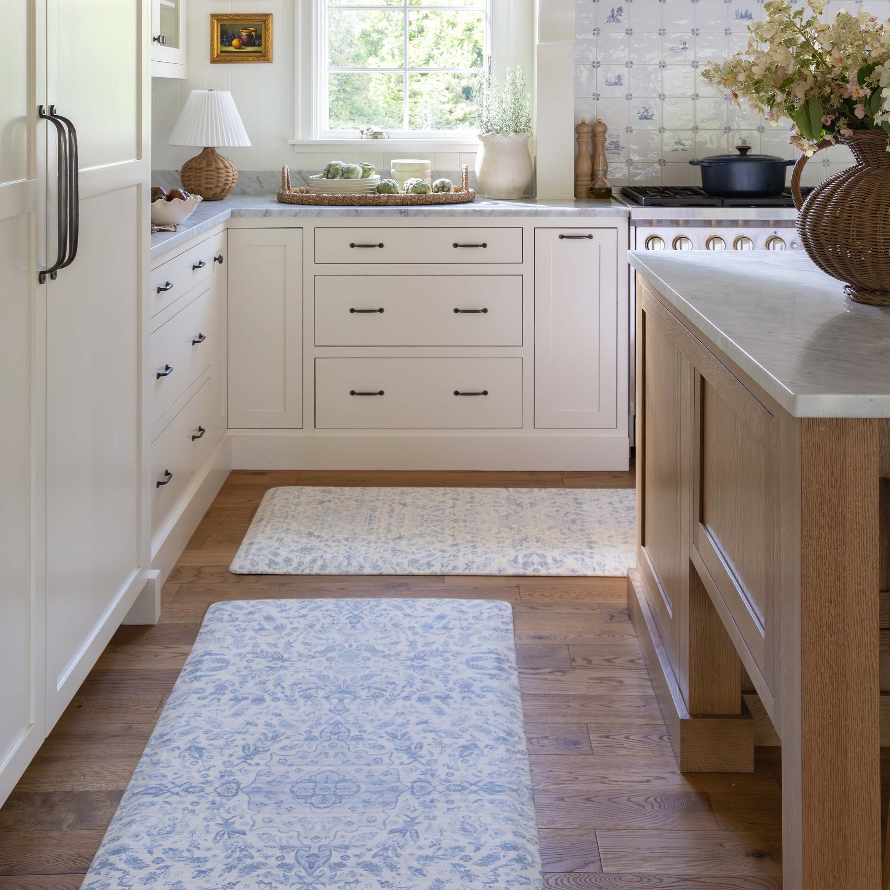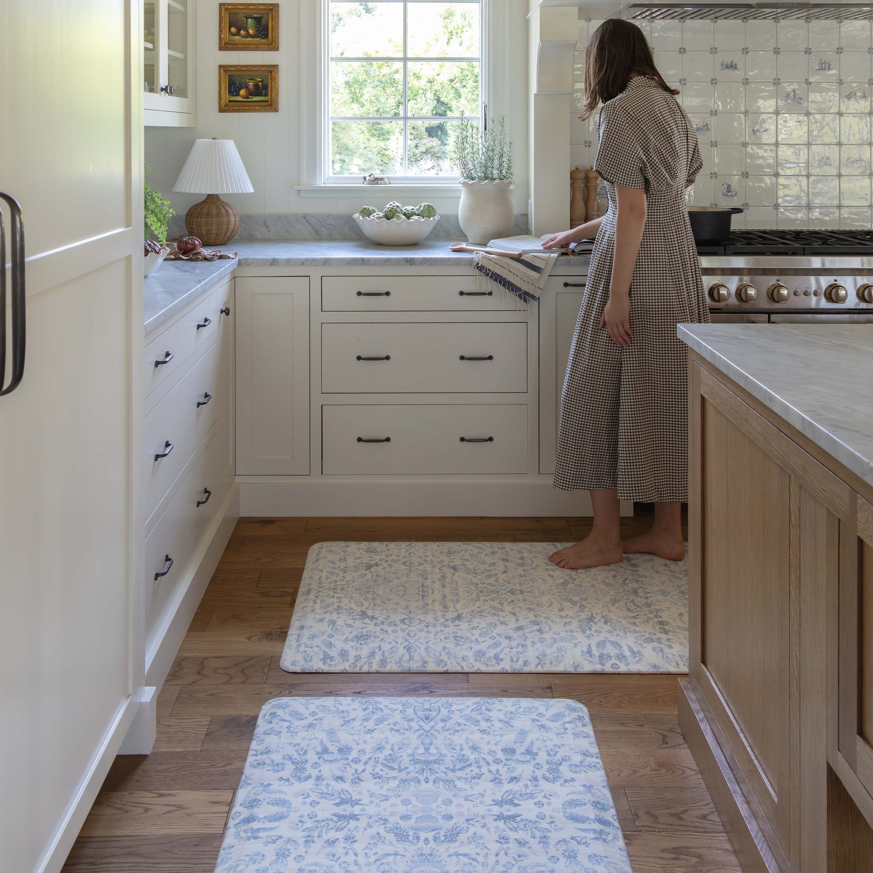 There are those of us who love a rare flea market find—and those of us who appreciate modern comforts. We created the Emile kitchen mat for both...With its feminine floral motif and rich colors, Emile captures the essence of a traditional Persian rug, but updates it with our super supportive, anti-fatigue ergonomic foam. Perfect in front of the kitchen stove, in the office as standing desk mat, or in the laundry room to provide support for your legs, back, and feet while standing. Our Emile anti-fatigue kitchen mat comes in a variety of sizes, including runners. Our anti-fatigue mats are like a one-of-a-kind heirloom literally landing at your (happy) feet.