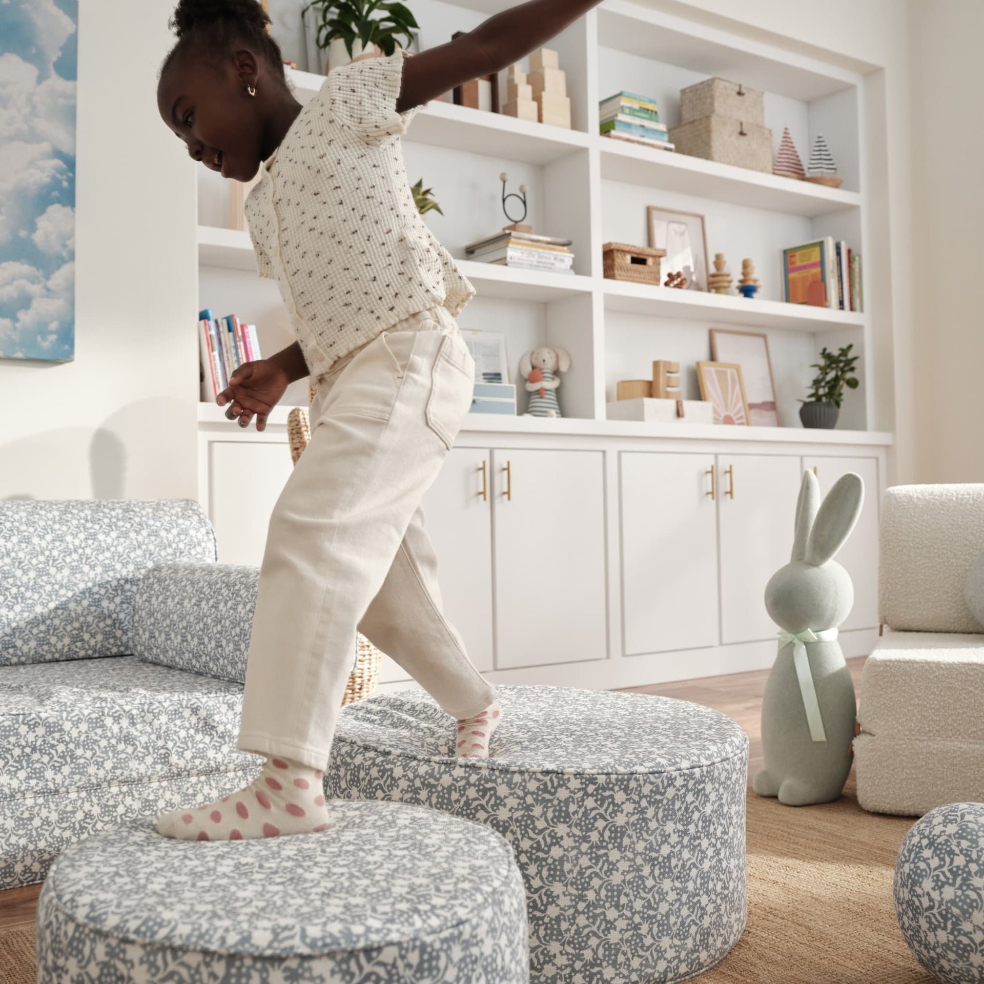 SmallKick your feet up onto this. Our ottomans come in two sizes, each with removable, machine-washable covers that can be mixed and matched for all of your pattern play needs. Whether you’re lounging, learning to pull up, or rolling them into your play fort, ottomans make the perfect addition to our modular couch sets and coffee tables. Waterproof liner included.
